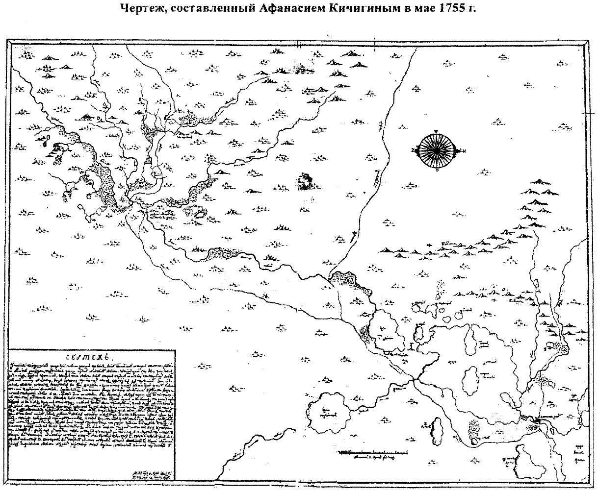 Рис. 1. Чертѐж Афанасия Кичигина, май 1755г. Местность по руслу реки Кыштым, где предполагалосьстроительство чугунолитейного и железоделательного заводов.