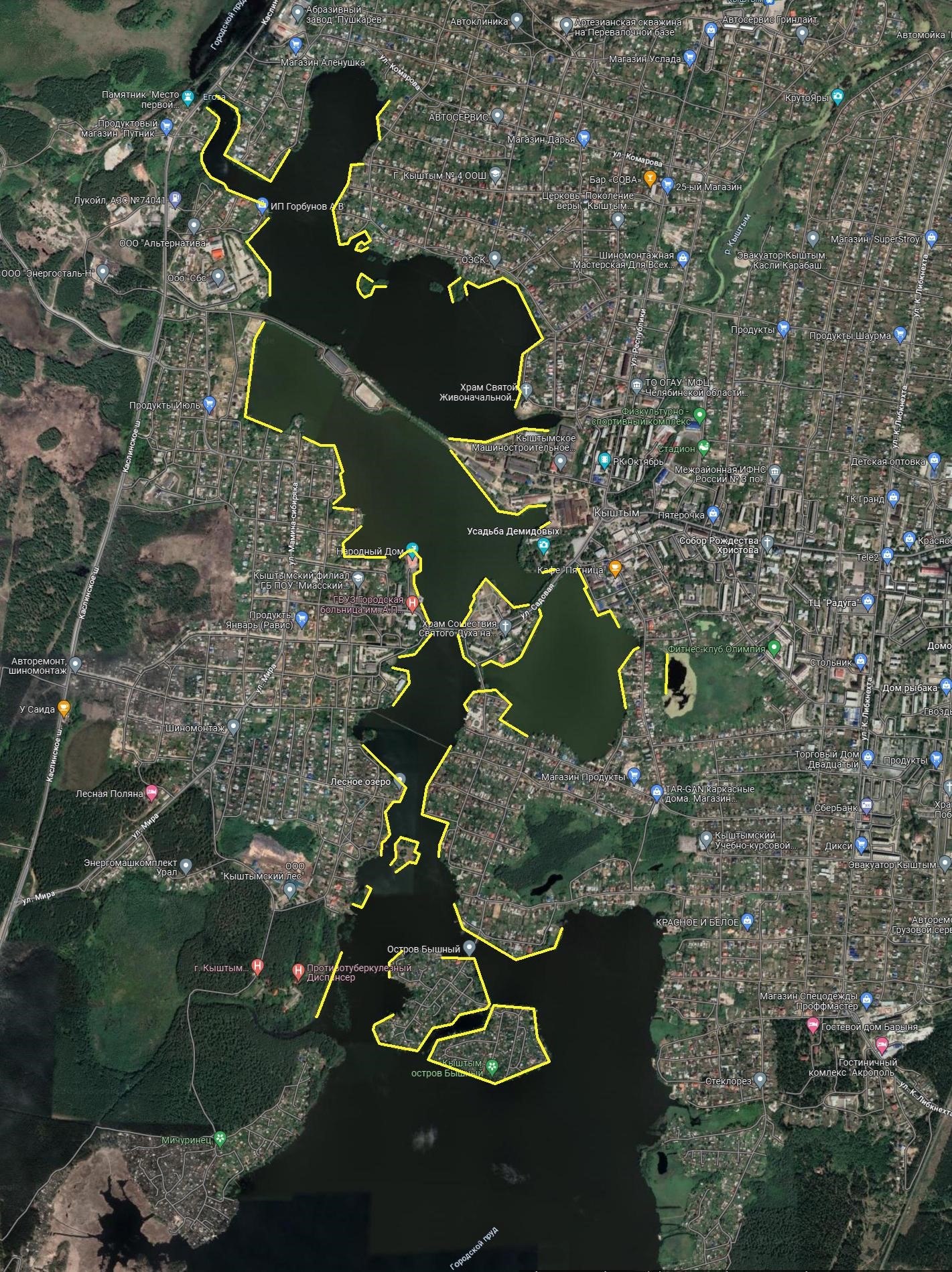 Фото 3. Город Кыштым (спутниковое фото) и кыштымский пруд. Спрямлѐнные участки береговой линии обозначены линиями жѐлтого цвета.