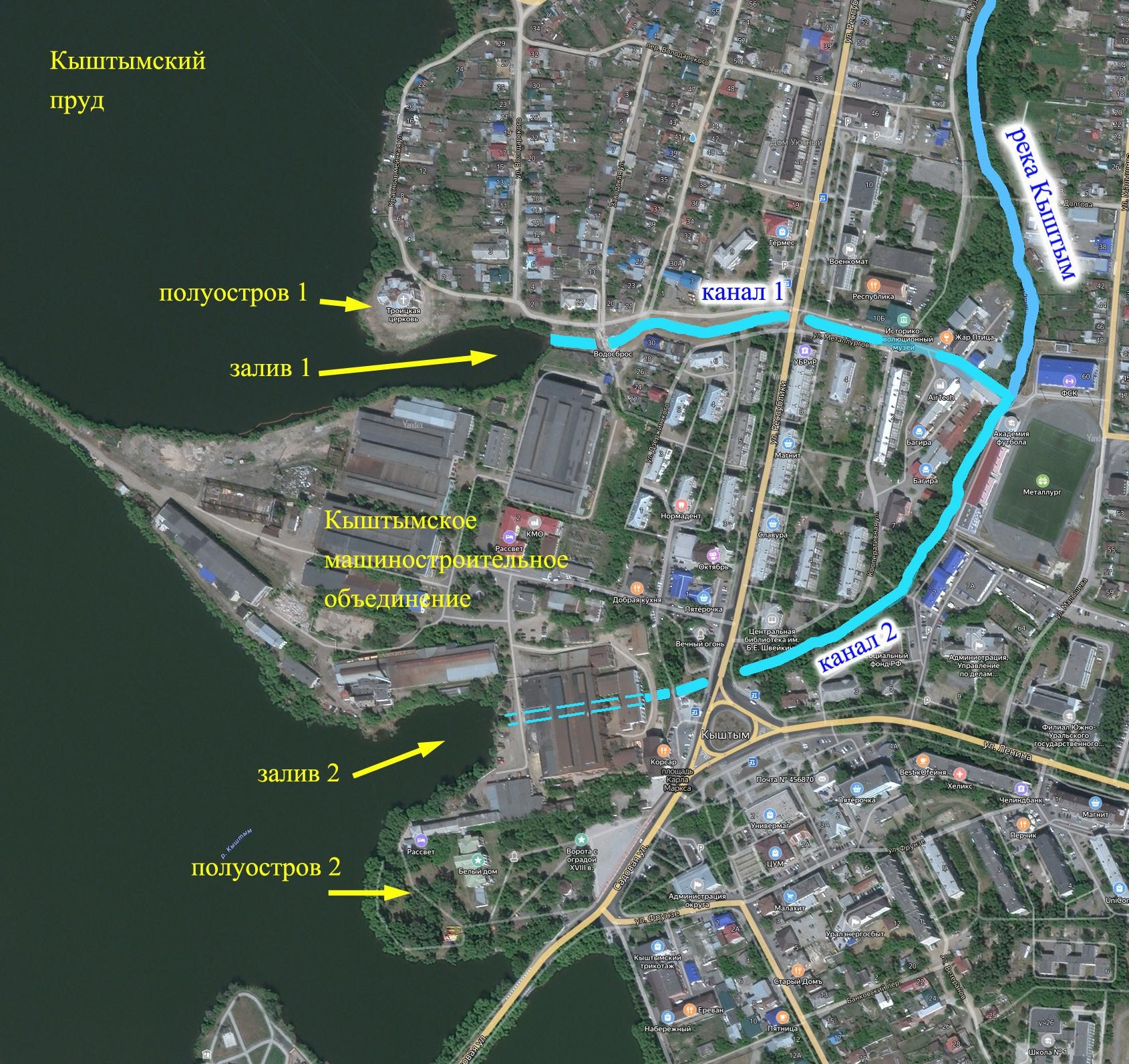 А само присутствие этих каналов на сливе воды из Кыштымского пруда в русло реки Кыштым говорит о том, что Кыштымский пруд существовал уже в рамках этой самой ДВК. Это прекрасно подтверждается анализом географии на спутниковых снимках территории г. Кыштым, о чѐм писалось ранее.