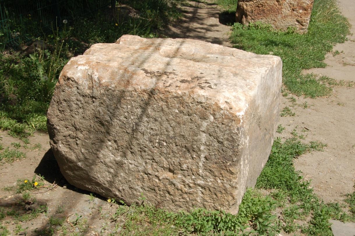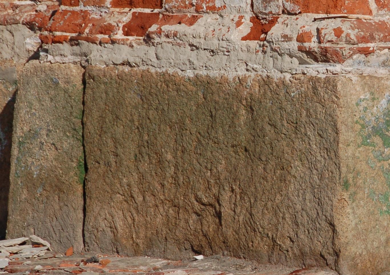 Но с другой стороны, степень эрозии поверхностей блоков фундамента церкви такова же, что и степень эрозии кирпича в еѐ стенах. Глубина сколов и выщербленных участков, откуда вывалились фрагменты материала на кирпичах, совпадает с глубиной неровностей эрозионной природы на блоках фундамента.