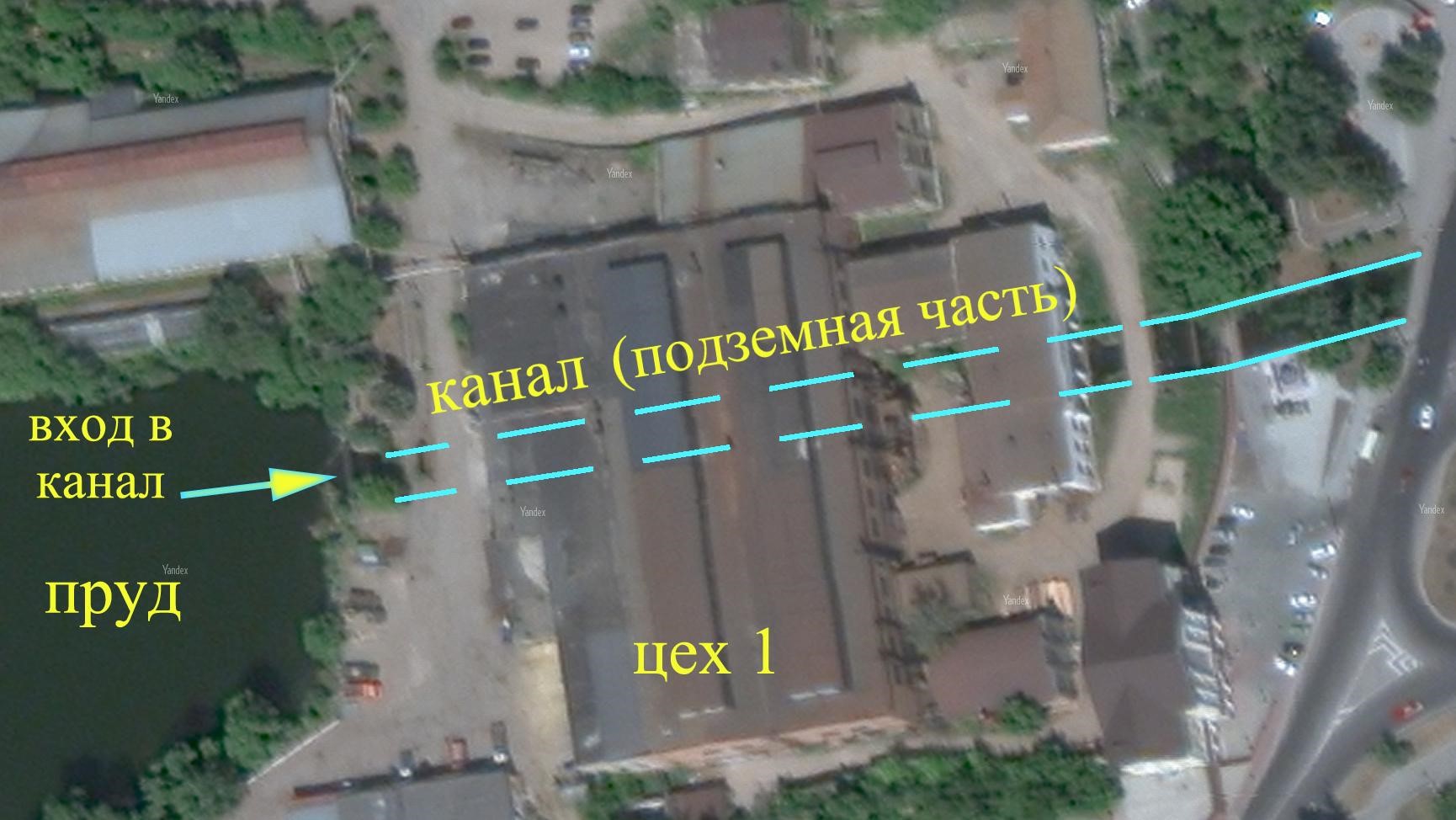 Фото 11. Местонахождение южного канала (кнала 2) под цехом Кыштымского машзавода.
