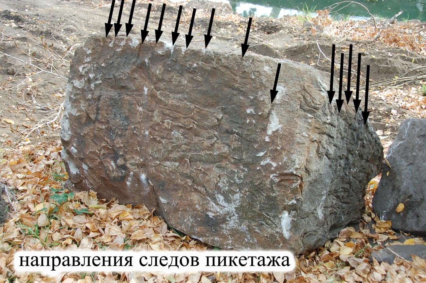 Однако, что касается блоков, извлечѐнных из канала 2, можно сказать, что нам повезло. На их боковых поверхностях можно видеть следы пикетажа - операции по обкалыванию лишнего камня для придания блокам необходимой формы, по сути черновой обработки изделия (фото 13).