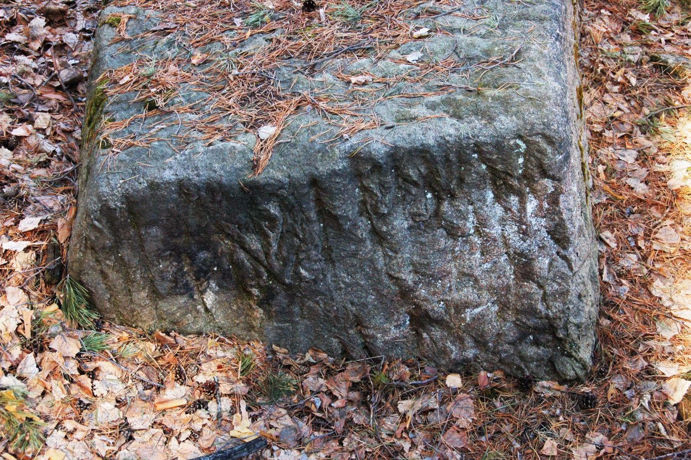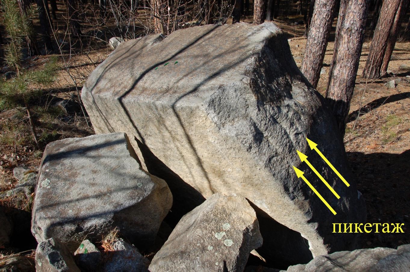 Фото 16. Блок «Дунькин сундук» (масса около 12т) на древней каменоломне между озѐрами Б. Акуля и Акакуль со следами пикетажа.