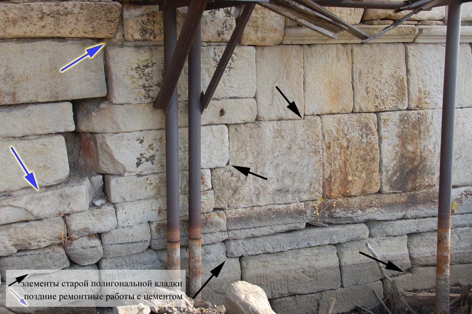 Фото 22. Стык между участками первоначальной мегалитической полигональной кладки и позднейших ремонтных работ с цементом