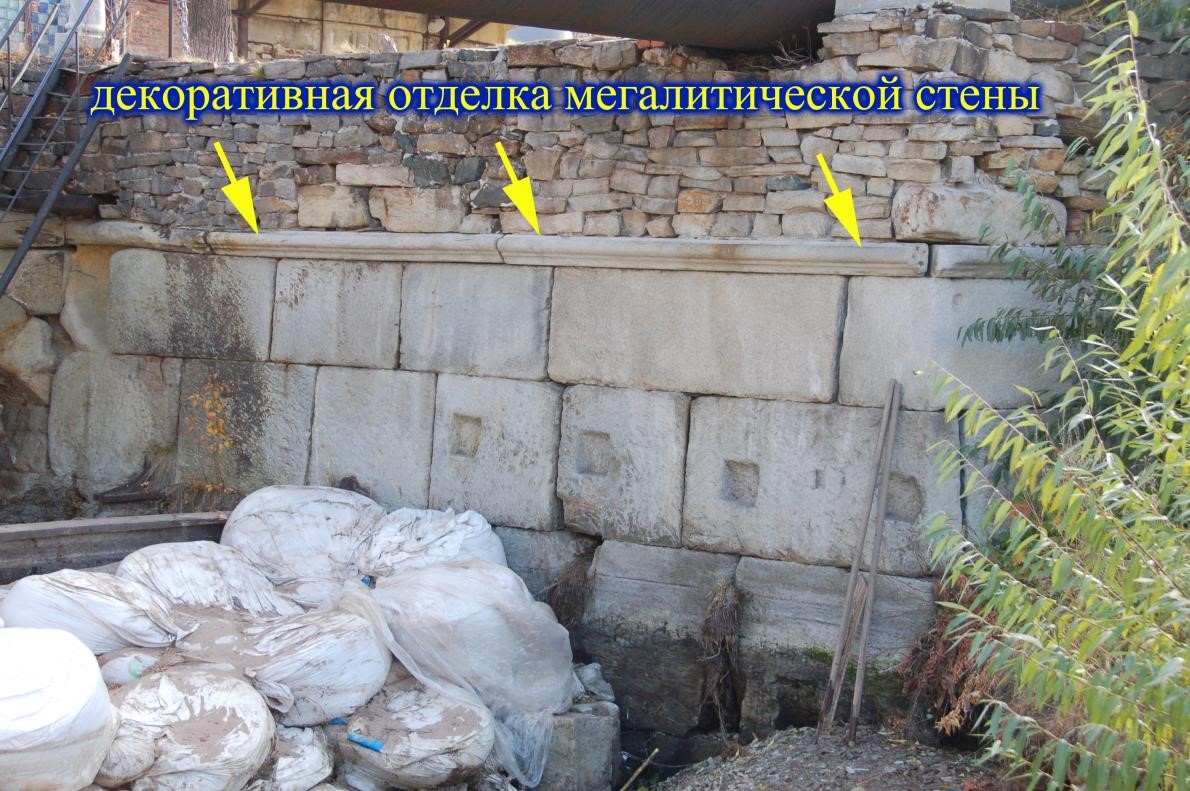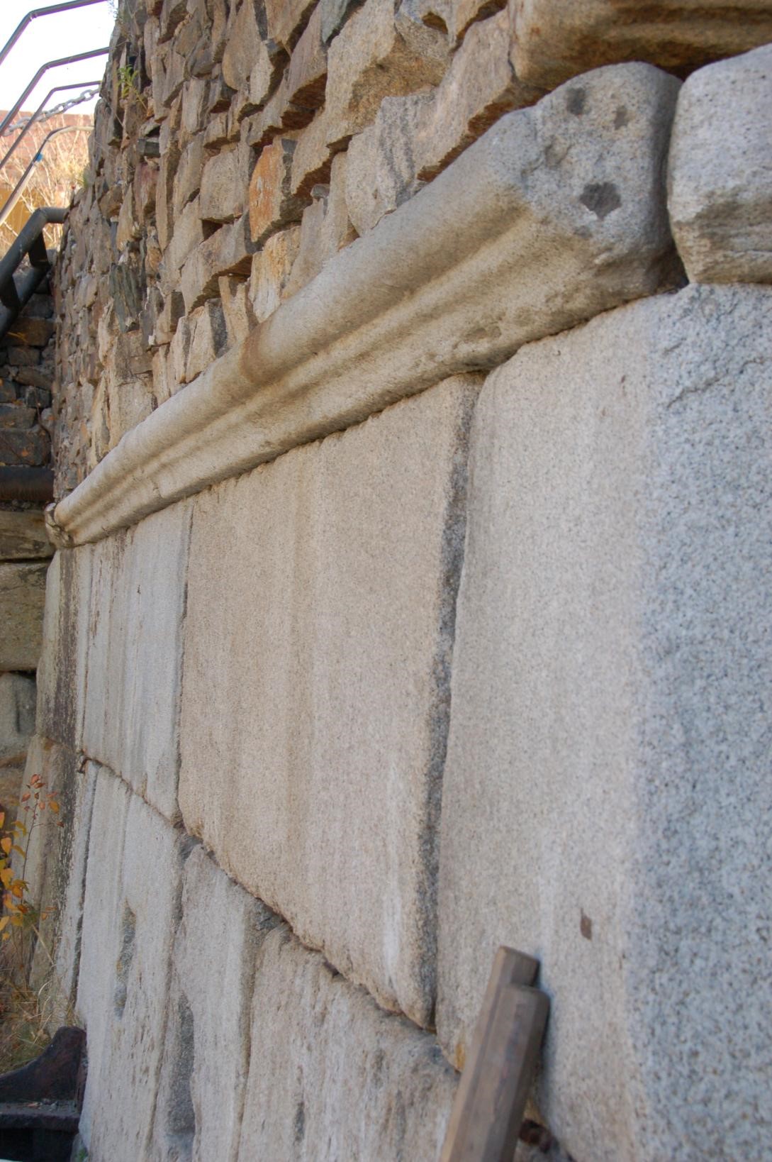 Здесь хорошо видно, что мегалитическая полигональная кладка из блоков массами в несколько тонн не только выполняет свои прочностные функции, не разрушившись в результате постигших эти места катастроф, но и прекрасно выполнена с эстетической точки зрения. Так, над блоками стены проходит полоса гранитных плит, которые имеют сравнительно небольшую толщину, но при этом выступают над плоскостью стены, создавая визуально некое декоративное обрамление. Этот выступ создан отфрезерованными участками гранита на торцах плит.