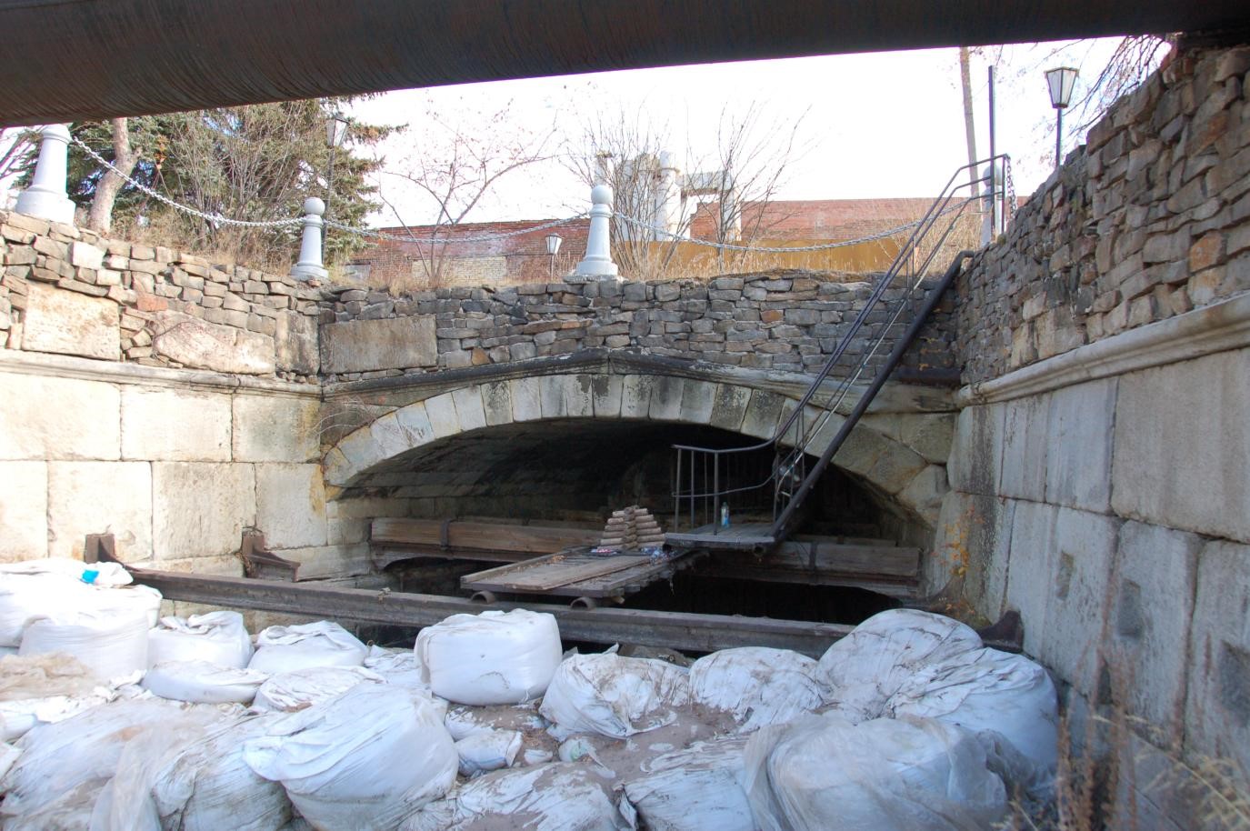 Далее перейдѐм, пожалуй, к осмотру собственно входа в канал. Я не буду рассматривать его подводную часть, так как близко к арке нас не допустили и рассмотреть то, что находится под водой, не было никакой возможности. Однако, о том, как устроено ложе реки Кыштым на этом участке, мы можем судить по описанию в статье Дайбова С.В., приведѐнному выше. Судя по всему, там имеет место лоток прямоугольного сечения, вырезанный в гранитном материковом основании.
