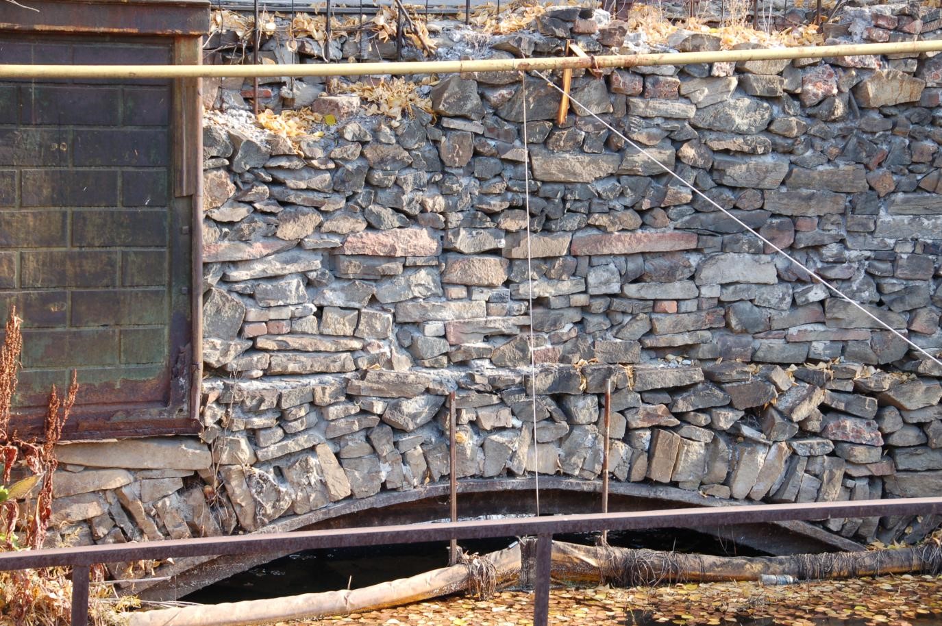 Мне не удалось побывать в подземной части канала. Однако входную часть удалось рассмотреть подробнее. Итак, обратим внимание на вход в канал, продолжающий русло реки Кыштым и пролегающий под цехом Кыштымского машзавода. Спуск к воде идѐт вдоль стены, выложенной камнем (фото 20). Кладка представляет собой сплошную эклектику стилей и материалов.