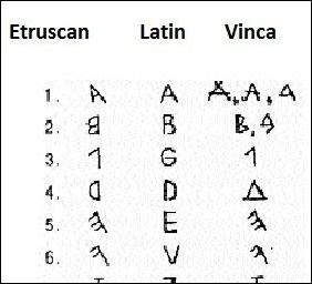 Рис. 48. Фрагмент алфавитов этрусского, латинского и культуры винча.