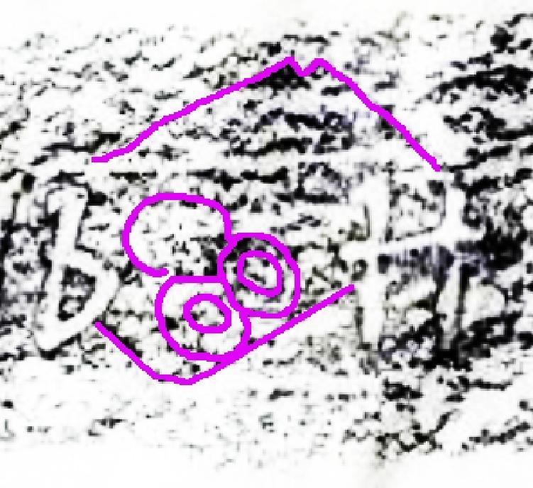 Однако, при внимательном изучении прориси видно, что участки, выделенные бирюзовым цветом на фото 10.136, не менее отчѐтливы, чем те, что выделены красным или пурпурным цветом. А значит вполне могут являться частями символа №2. Причѐм, как оба элемента одновременно, так и по отдельности. Но тогда это не семѐрка, а какой-то иной знак. Так, например, если считать, что знак №2 состоит из красной, пурпурных и бирюзовыхчастей, можно предположить, что это символ, соответствующий символу