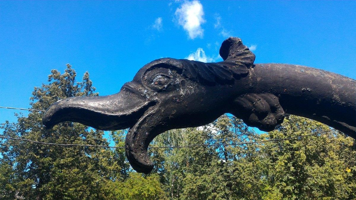 Любой человек, впервые взглянувший на эту деталь фонтана, задаѐтся вопросом: а что за существо здесь изображено? И вот тут большинство людей ошибается. Судя по тому, что пишут люди в интернете, это лебеди. Иногда даже встречается некое народное название фонтана – «Чугунный лебедь». Однако, на лебедя это существо не очень похоже. Один хищно изогнутый клюв чего стоит. Зато подробное знакомство с иконографией древних существ (неважно реальных или выдуманных) позволяет определить вид животного, шея, голова и начала крыльев которого изображены по бокам фонтана.